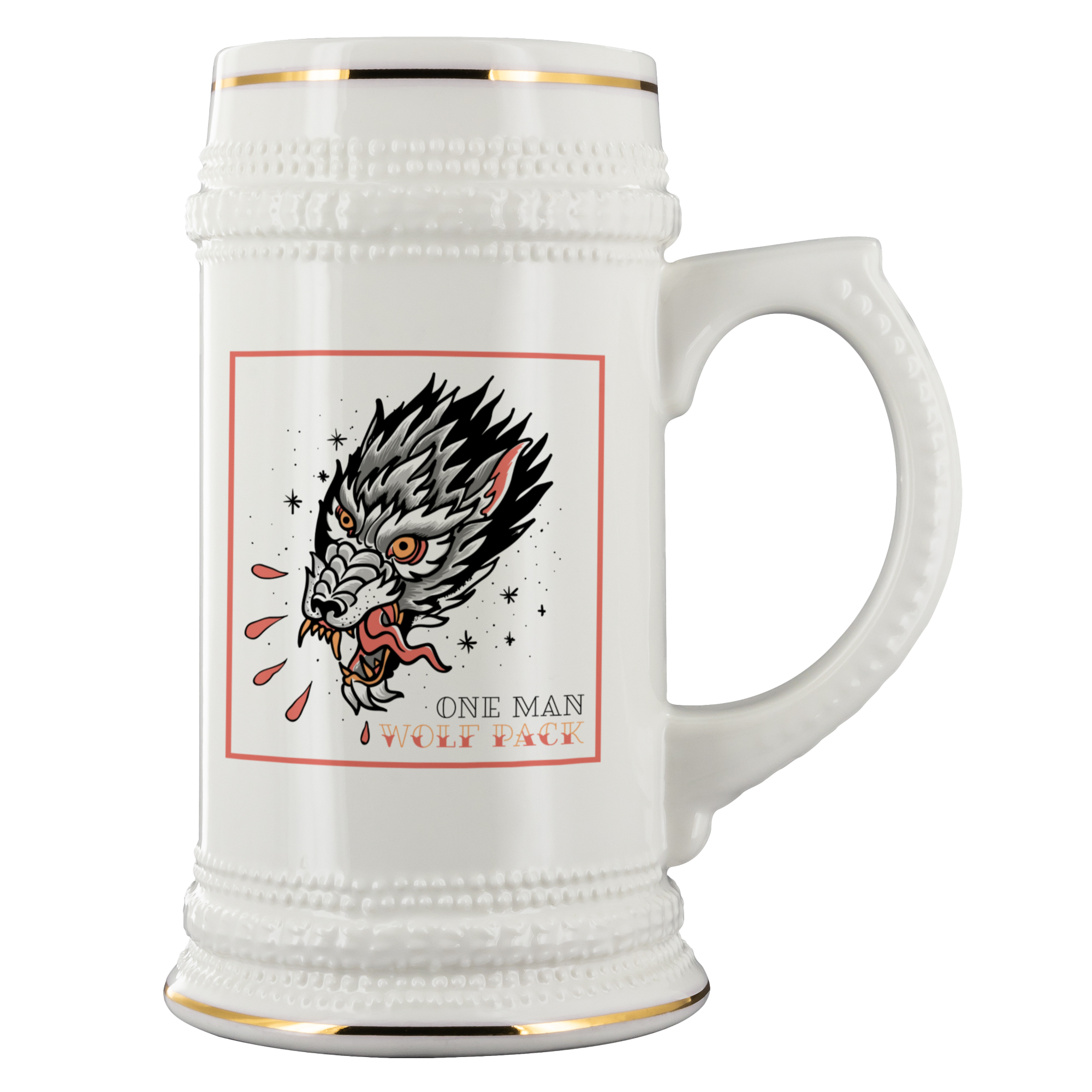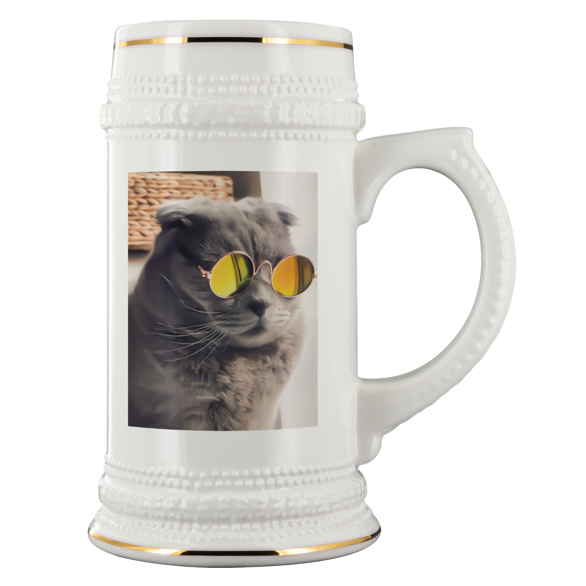 Another reason to avoid designs with sharp edges is human error. There is always an element of human error involved in the Print On Demand process and the beer steins are no different. When placing the sublimated printing paper on the stein before the heating process takes place, someone has to line the printing paper around the product. Sometimes the end result of this is a graphic that is not 100% level. This is typically not a huge issue as it usually is a difficult thing to spot UNLESS there are sharp edge lines in the design. Sharp edges in a graphic tend to stick out like a sore thumb if there was any sort of mistake made during the alignment process of the sublimation paper.