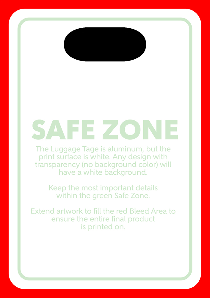 The red Bleed Area represents the edge of the product and then some. Since the luggage tags are full print, it is important to extend your artwork all the way through the bleed area. The bleed area will likely not show on the final product but if you do not have any artwork/color/texture you run the risk of having blank (white) portions that appear on the tag. Bleed areas within print templates are in place as a preventative measure in case of errors that can occur in the printing process.