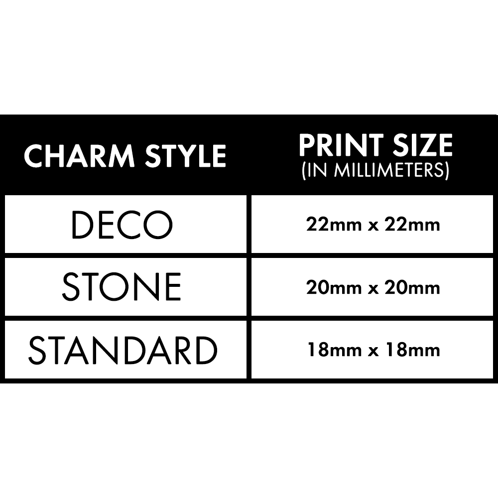3.) Font Size: We commonly get asked what is the smallest font size that is acceptable for charm designs. This is a difficult question to answer as there are many typefaces with different weights, styles and size variations. A rule of thumb for choosing typefaces and typeface size is if it is difficult to read in the chart above (Sect. 1 of Design Tips) at 100% view, it will be difficult to read on the final product. If you insist on using a smaller typeface, we recommend choosing a font that is legible as well as spacing your text out enough to easily distinguish what each letter is. More often than not, serif fonts tend to work the best in these situations due to the unique stems at the top/bottom of each letter that makes it easily identifiable.