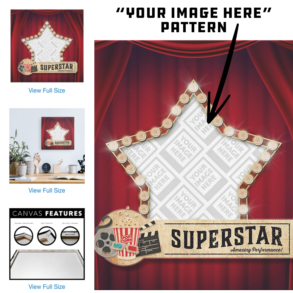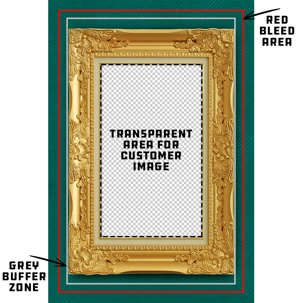 You MUST create artwork that has a portion of transparency for the personalization feature to work properly. The transparent portion of your design is the area where your customer’s image will be placed and show through behind the design you have created. If you do not have transparency within your design that you upload, the canvas will print without the personalized image from your customer. It is also important to make sure that any transparent portions of your design remain inside of the buffer zone. If you do not keep the transparency inside of the buffer zone we cannot guarantee that your customer’s image will remain on the front of the canvas.