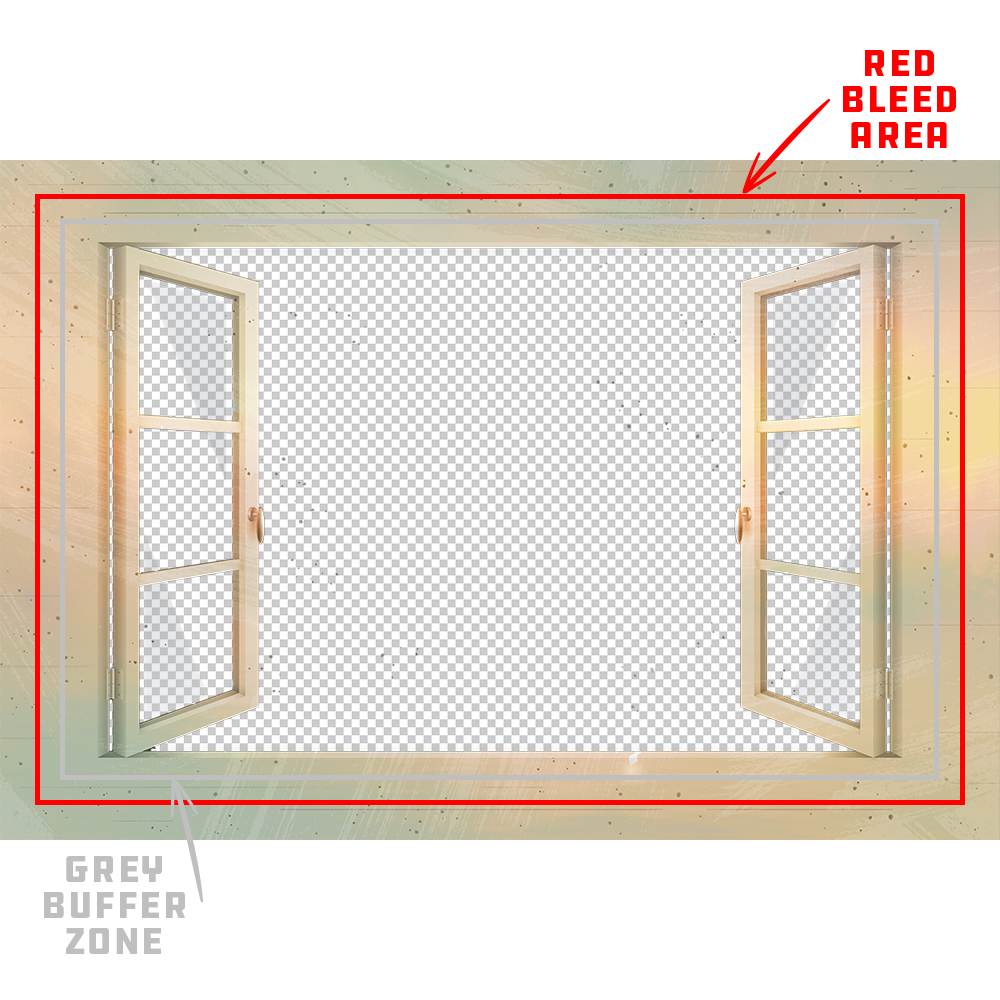 The red Bleed Area represents the edges of the canvas as well as the sides that wrap around to the back of the canvas frame. Although the bleed area does not represent the front of the canvas, it is important to extend/continue your artwork through the bleed area to ensure no unwanted blank (white) areas appear on the final print. Having artwork on the sides of the canvas is part of the appeal of a gallery style canvas wrap so we recommend applying some sort of continuation of background artwork in the bleed area.