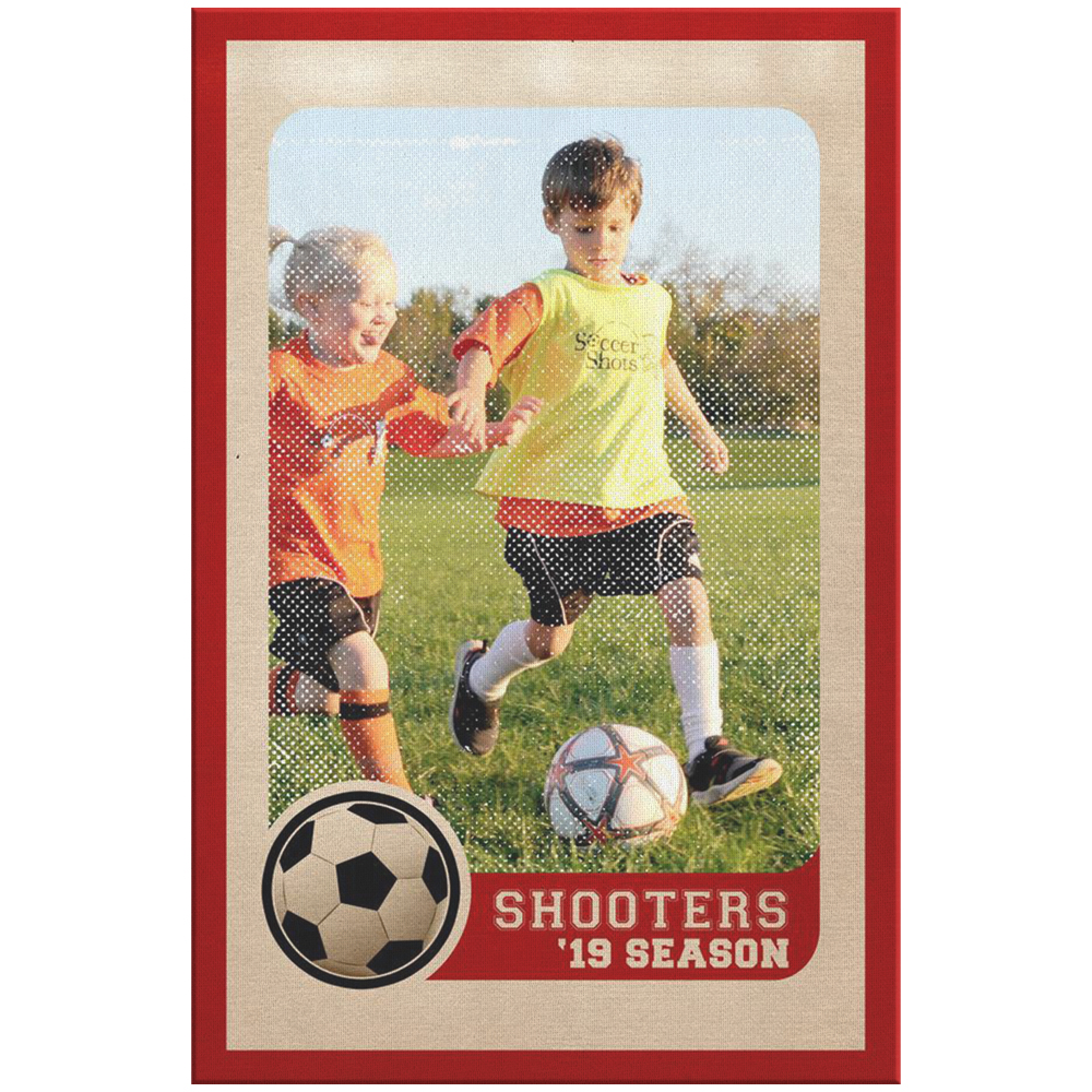 Be aware that any sort of blending modes you choose to use DO NOT affect the transparent portion of your design. Although it will work within your design software, it will not apply the blending mode on the finished PNG. If you would like to add special effects such as texture or gradients to the transparent space of your design, it is highly recommended that you stick to opacity changes. We have an example of a canvas overlay that looks like a sports card below. To give the effect of vintage dots and texture over the customer’s image, we added a white halftone texture in the transparent space reserved for our customer’s image. We then lowered the opacity to 35% so it would allow the image to show through, but also gives the effect of texture. Creating a design that utilizes this technique will ONLY work if you strictly use changes in opacity. If you try to achieve this look with blending modes, it will not turn out as expected because the blending mode will not take affect after the file is saved and uploaded into the app. Blending modes will only work inside of your design software and are meant to be saved for the end result of a design (i.e. finished design with no transparency included).