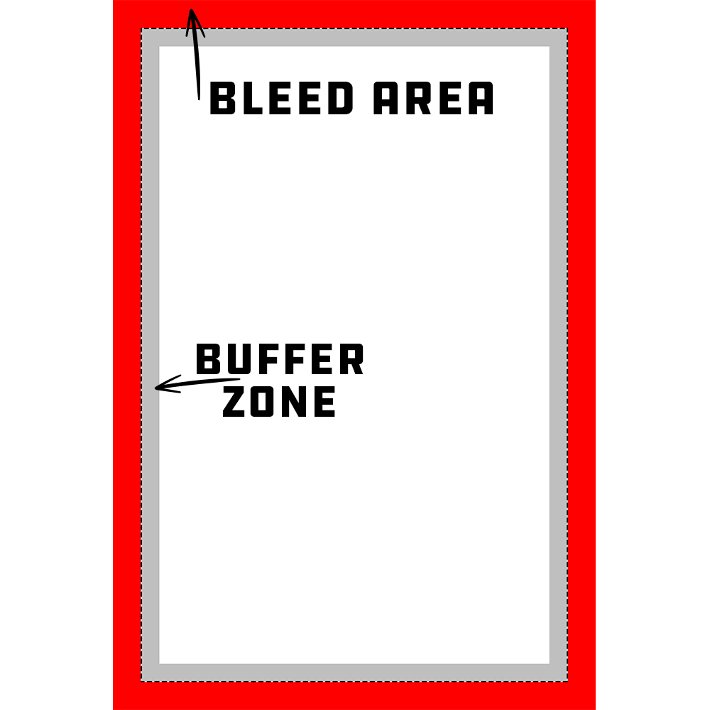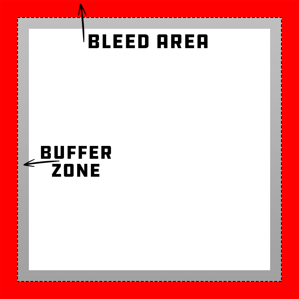 Unlike our other print templates, there is no marked safe zone. The reason for this is because we do not want the template to influence the creative potential of your design framework. We do, however, have a bleed area and buffer zone to help guide you through the design process so important aspects of your design will appear on the front of the canvas if followed correctly.