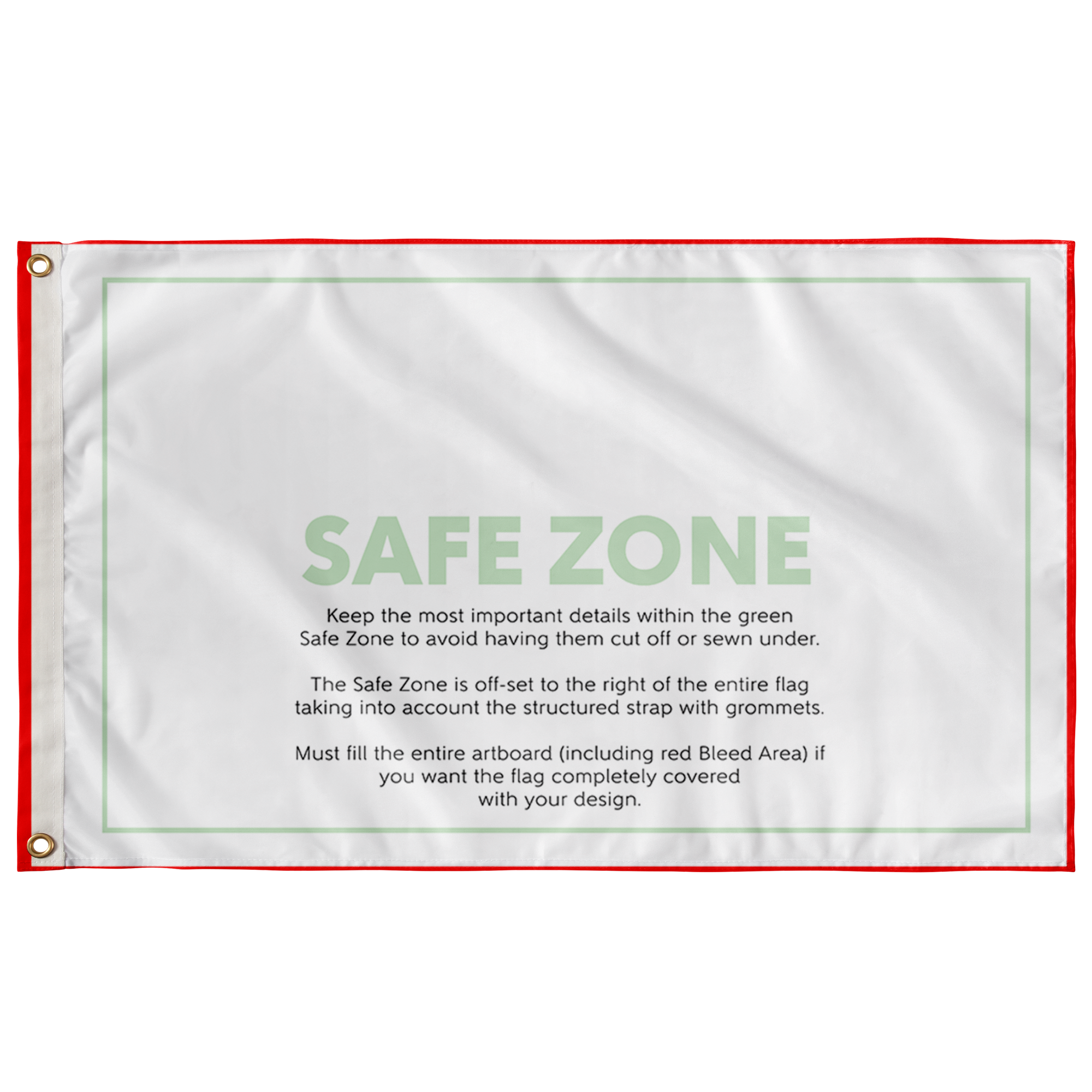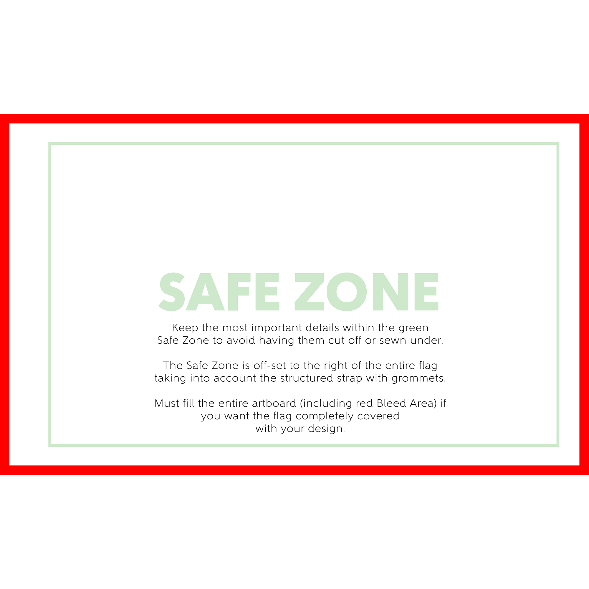 The safe zone is not centered on the flag. It is off-set from the grommet side of the flag. Since the entire flag gets printed on, we have shifted the safe zone to prevent users from accidentally placing important graphical elements on the structured band (with grommets). Essentially this will allow your main artwork to breathe by giving ample space from the edges of the flag.