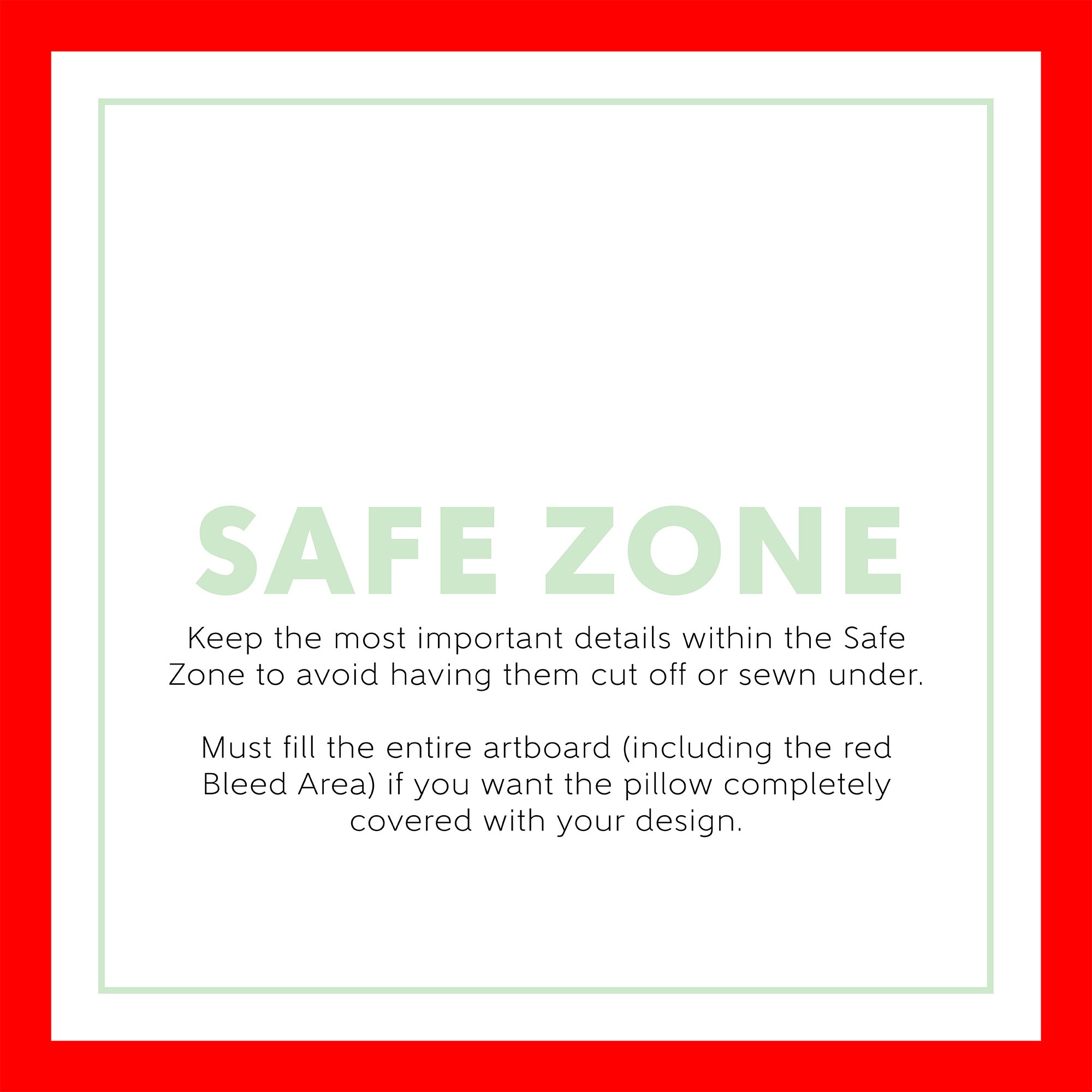 When using the template to create your artwork, pay close attention to the Safe Zone. The safe zone is denoted by the green box. The most important aspects of your design should remain within the safe zone to ensure they are printed on the final product. Anything outside of the safe zone runs the risk of getting trimmed off. Also keep in mind that the pillows are filled (or will be filled) with stuffing which means your design may warp and appear closer to the edge of the product than it would if the product was completely flat.